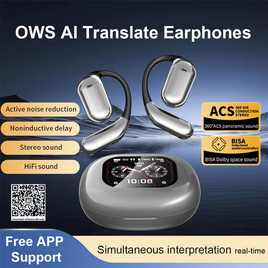 2025 New AI Dialogue Translation Earphones Bluetooth 5.4 LCD Touch Screen OWS Open Earhook Noise Cancellation Headset for Travel